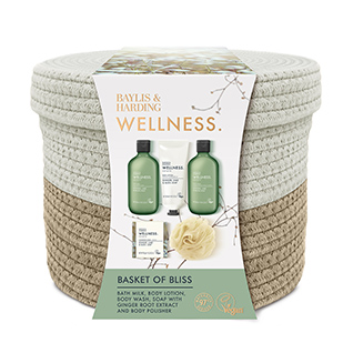 A contemporary basket gift set including 300ml bath milk, 300ml body wash, 130ml body lotion, 150g soap and a body polisher.