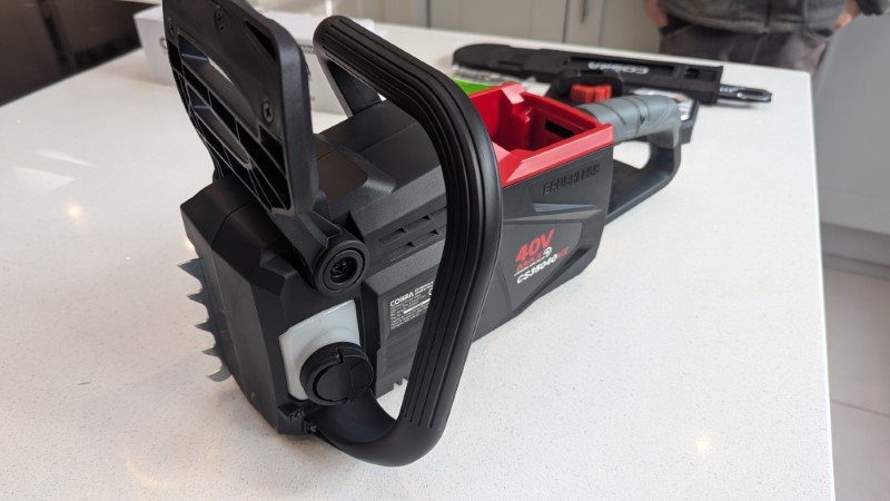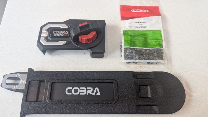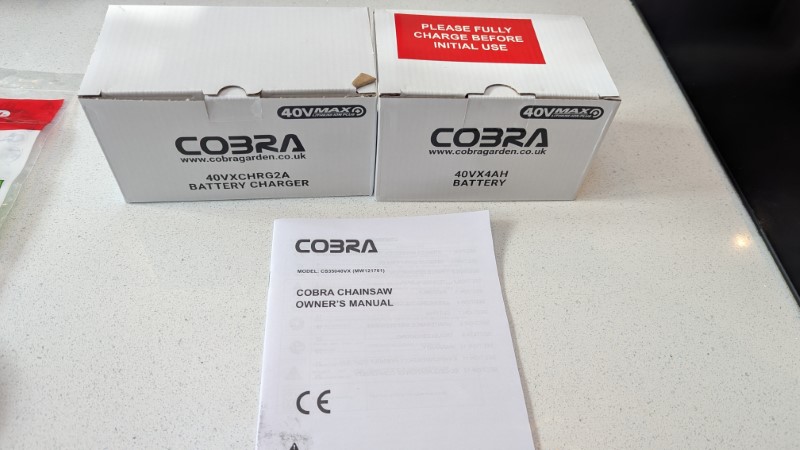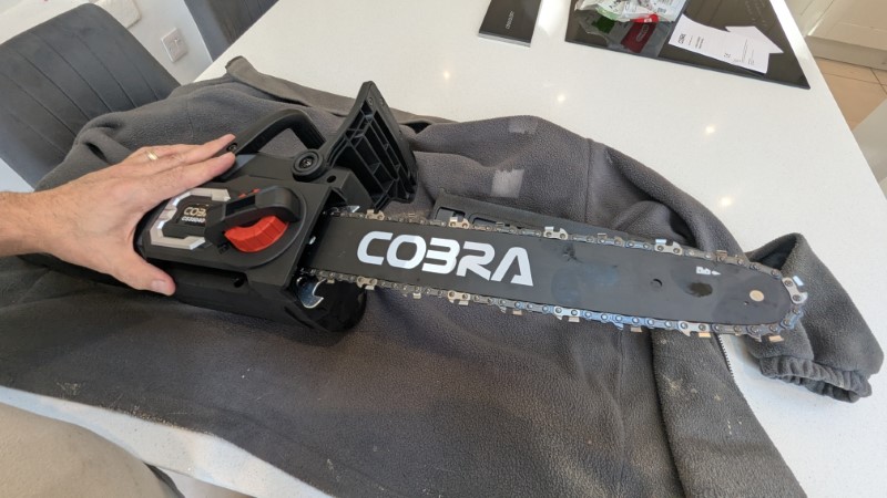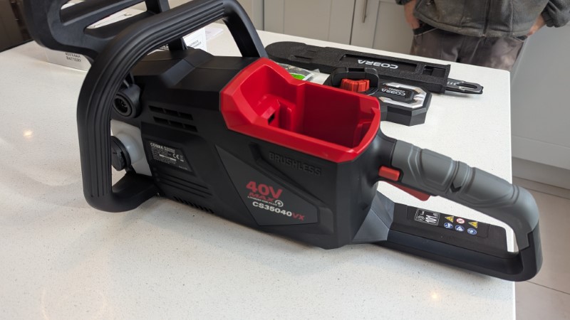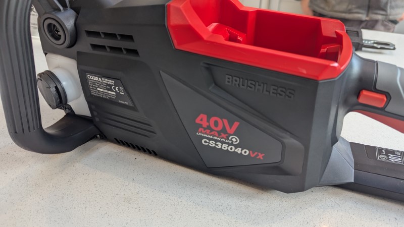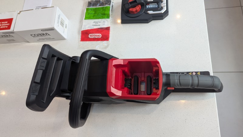 So, onto the point, the Cobra CS35040VX chainsaw. It’s got a brushless 40V motor and a 14″ bar. We also have an older Cobra 40v mower (review here), and it’s worth noting the batteries are different.