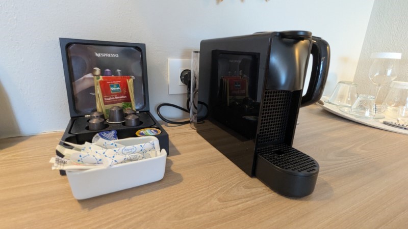 There’s a Nespresso coffee maker and pods as well as tea, milk and sugar.